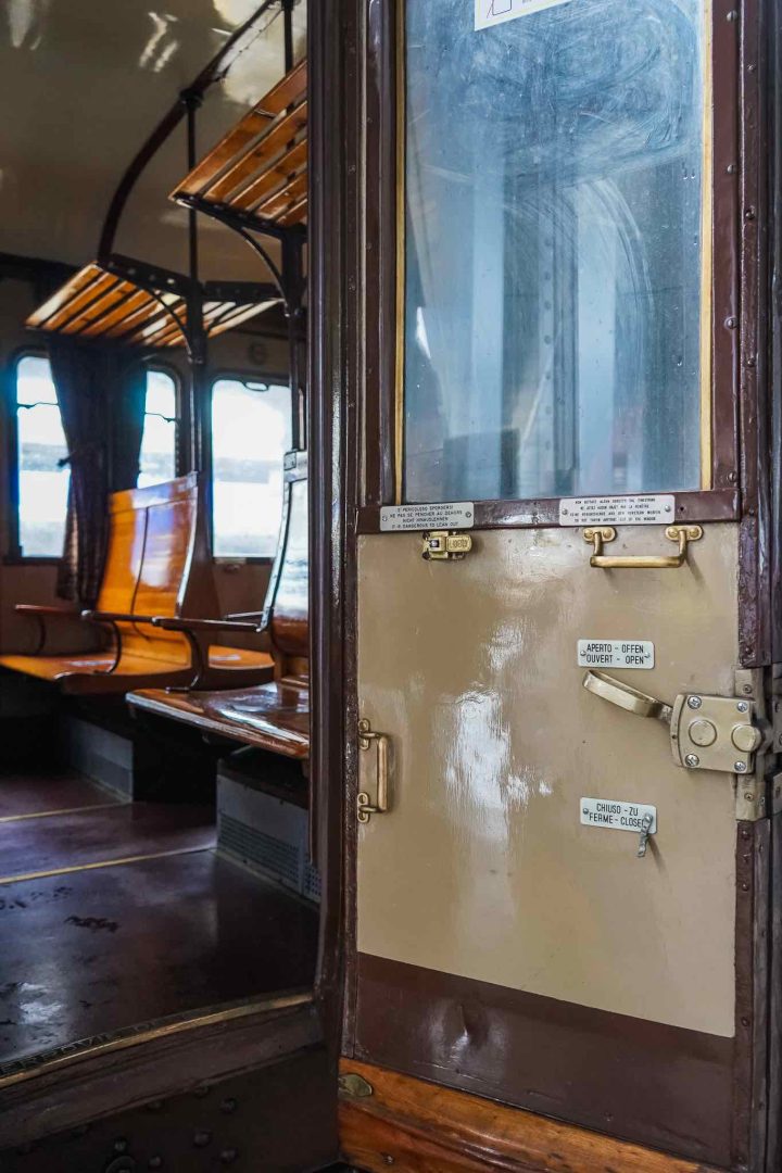 I hop on the train to the tune of traditional songs played by a group of folk musicians who travel with us for the entire trip. Once inside, you’re immediately transported back to the days when train travel was considered a privilege. The interiors are stunning and retain historic features like original brake pads, old prints, and antique lighting. The beautiful vintage wagons are divided into two types of carriages: the “Centoporte” with original wooden benches and the more modern “Corbellini” with red padded armchairs and more panoramic windows.